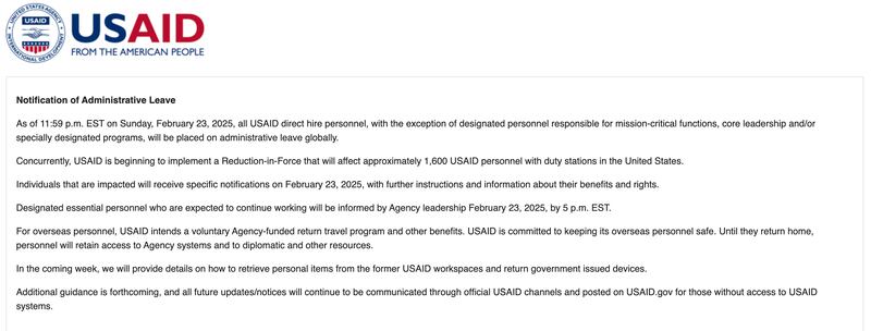 “As of 11:59 p.m. EST on Sunday, February 23, 2025, all USAID direct hire personnel, with the exception of designated personnel responsible for mission-critical functions, core leadership and/or specially designated programs, will be placed on administrative leave globally,” the notification said.