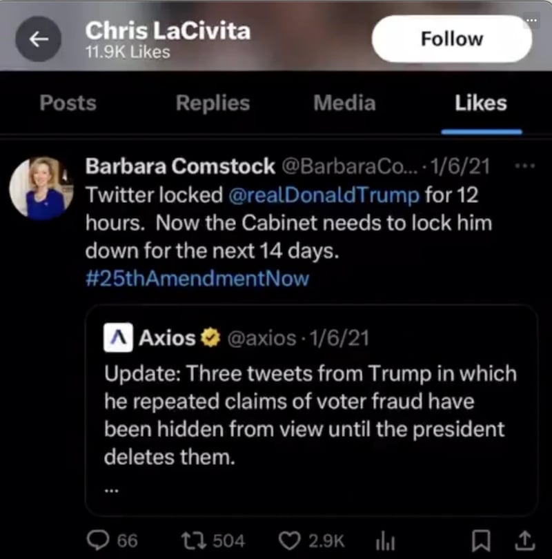 After Twitter temporarily locked Trump out of his account for lying about the election results, then-Rep. Barbara Comstock called on his Cabinet to invoke the 25th Amendment to the Constitution and remove Trump from power until Biden took office.