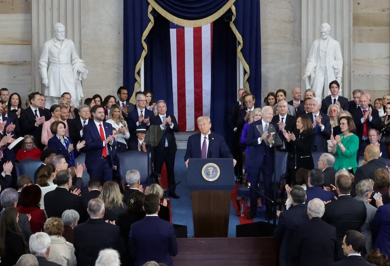 Joe Biden and Kamala Harris showed little emotion during the speech. Bill and Hillary Clinton whispered and laughed with each other when Trump mentioned he planned to change the name of the Gulf of Mexico to the Gulf of America.