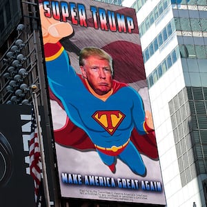 Ron Galella/Ron Galella CollectionA Trump-backing super PAC spent $25,000 on a digital billboard portraying Trump as Superman in 2016. Trump’s eldest child, Donald Jr., posted a bizarre image of a fake Time cover featuring his father as a bearded Superman in 2017.