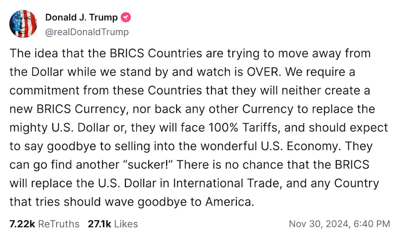 “The idea that the BRICS Countries are trying to move away from the Dollar while we stand by and watch is OVER,” he wrote Saturday on Truth Social, referring to the bloc that also includes Brazil, India, China, South Africa, Iran, Egypt, Ethiopia and the United Arab Emirates.