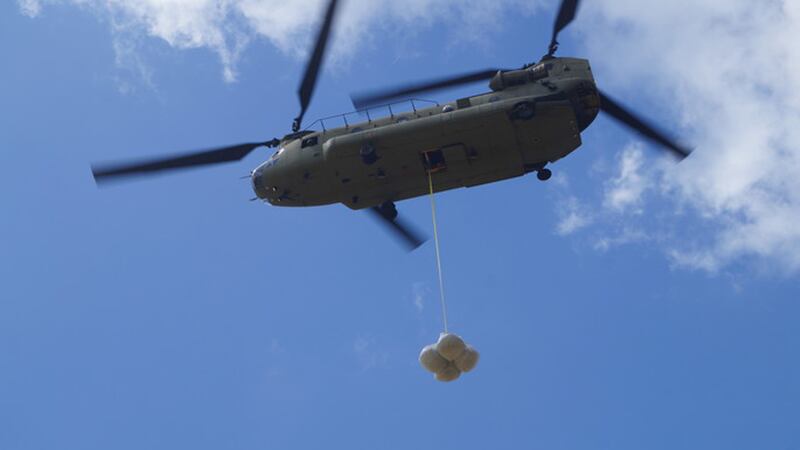 On Tuesday, a Chinook helicopter carrying four gigantic sandbags on a 40-foot tether, clustered like a garlic clove, to its target: an enormous sinkhole where the spillway from the Guajataca Dam had collapsed. The chopper held steady in place until the cords holding the 3,500-pound sandbags were motionless and perpendicular to the ground. Then with pinpoint precision lowered its 14,000-pound load right next to another bundle on the ground. A second Chinook followed, repeating the same maneuver, then a third.
