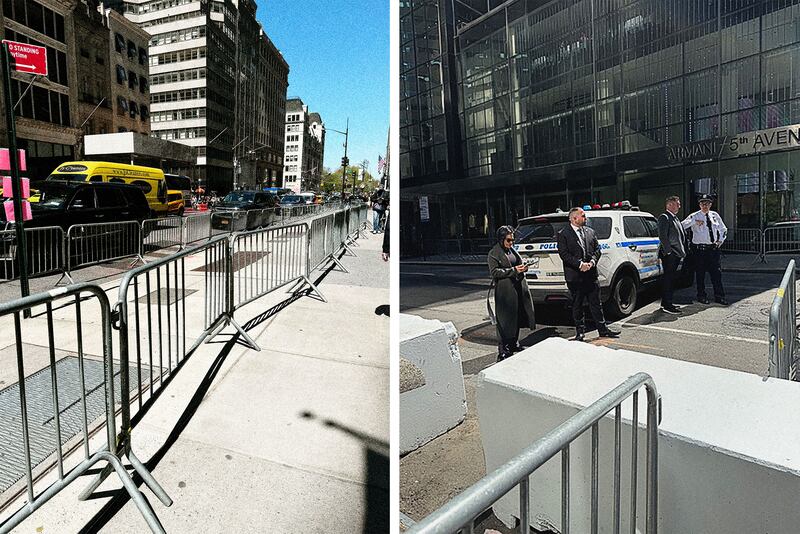 Metal barriers take up half the sidewalk and serve two purposes: (1) to hold back crowds; and (2) to force people to cross the avenue if they want a selfie of themselves giving the finger to Trump Tower.