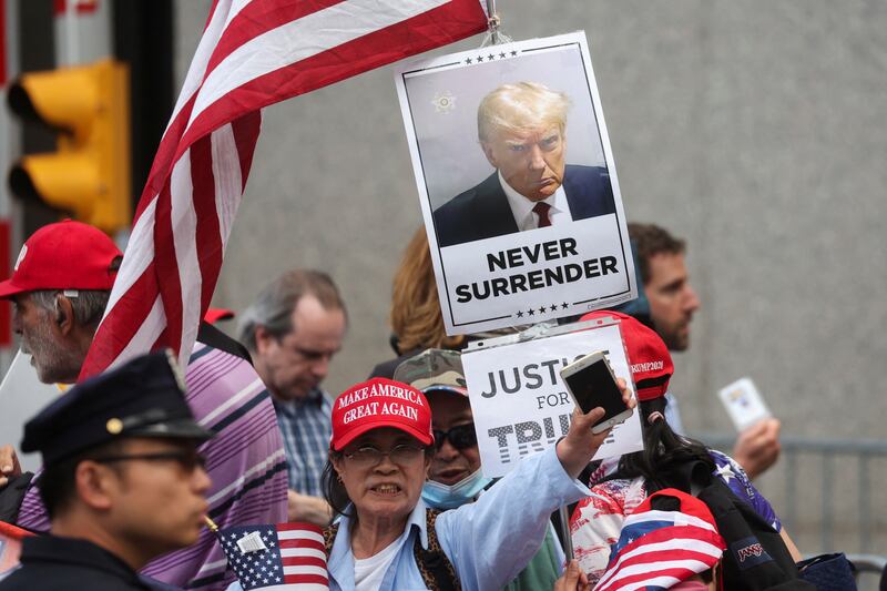 Supporters of former U.S. President Donald Trump demonstrate following the verdict in his criminal trial over charges that he falsified business records to conceal money paid to silence porn star Stormy Daniels in 2016, in New York City, U.S. May 30, 2024.