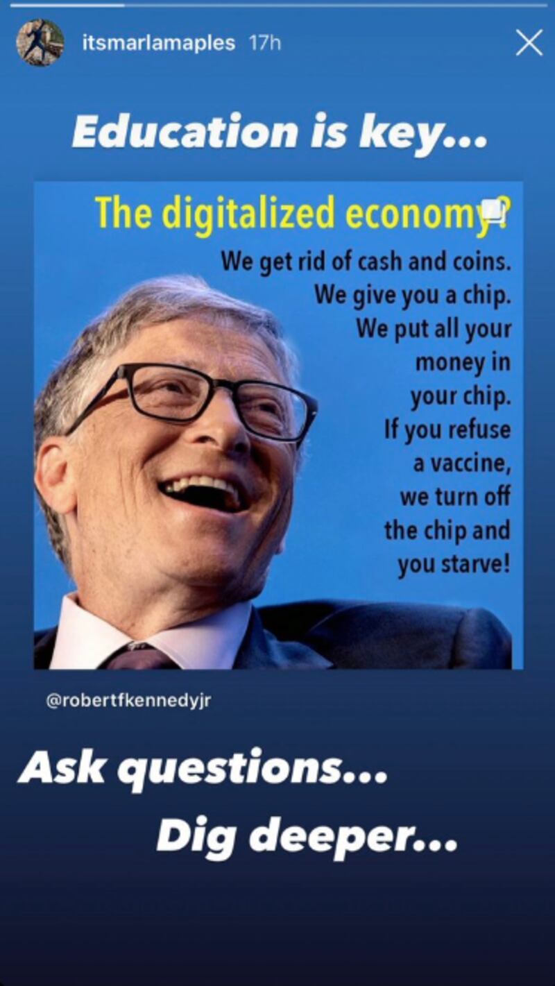 “Education is key...Ask questions...Dig deeper…,” Maples wrote over the Instagram Story, which bore the vague header: “The digitalized economy?” If users dug deeper, clicking through to the original post, they could find two clips from an uncited video. The footage splices clips of Bill Gates talking about access to vaccination—playing, for unclear reasons, on a vintage IBM monitor—with disembodied commentary accusing the Microsoft co-founder of seeking “control over our identities...control over our transactions...and even control over our bodies.”