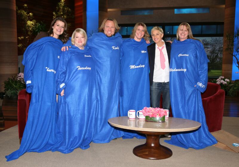 Ellen DeGeneres is always very welcoming of her guests, often giving them parting gifts from her show. So when the stars of TLC's Sister Wives stopped by this past week, DeGeneres was especially considerate. DeGeneres presented Kody Brown and his four wives with embroidered outfits, and tweeted, "What kind of gift do you get for a man and his 4 wives? Easy. Snuggies." Notice the Monday, Tuesday, Wednesday, etc. labels on the Snuggies?