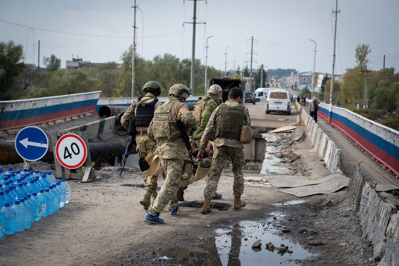 Ukrainian soldiers carry a wounded comrade across a heavily damaged bridge over the Oskil River on Sept. 30, 2022 in Kupiansk, Ukraine.