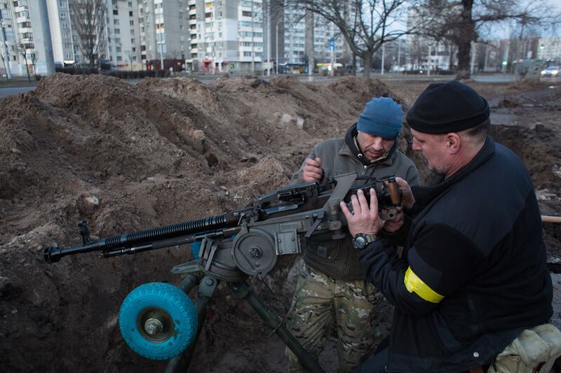 Members of the territorial defense battalion set up a machine gun and organize a military redoubt on February 25, 2022 in Kyiv, Ukraine.