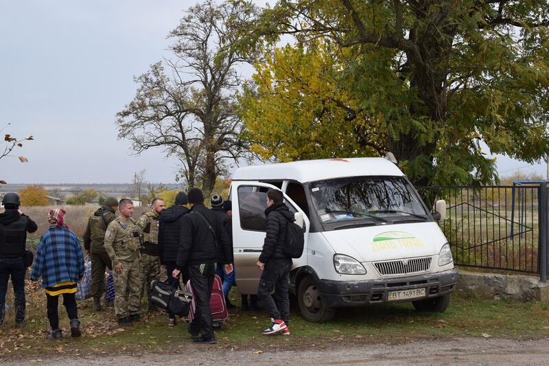 Refugees pile into a waiting van in Dudchany, Ukraine, October 31, 2022.