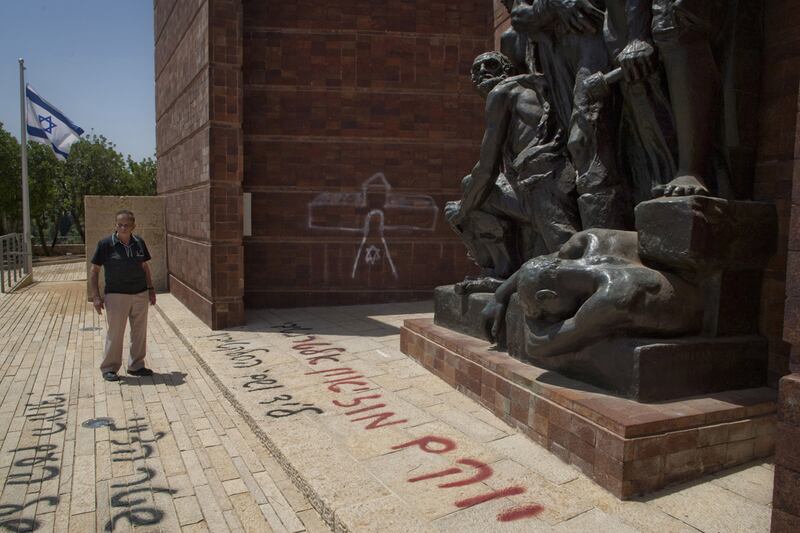 On a typical Sunday afternoon, the central courtyard at Yad Vashem, Jerusalem’s storied Holocaust memorial, is filled with visitors: Tel Aviv tourists, Israeli Defense Force cadets, American Birthrighters. But on an unseasonably cool day yesterday, the memorial’s gates were ringed with security tape, its walls stained with black paint. Beside a statue of Mordecai Anielewicz, the hero of the Warsaw uprising, dripped a crude cartoon of an Auschwitz-bound train. Below an engraved procession of victims looped rows of hateful graffiti: “Hitler, thanks for the Holocaust,” “Israel is the secular Auschwitz,” and so on.
