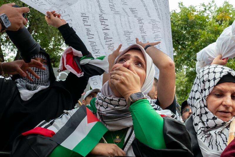 A protester weeps looking at the names of deceased children typed on a scroll during a rally in support of Palestinians at the Texas State Capitol in Austin, Texas, on November 12, 2023.