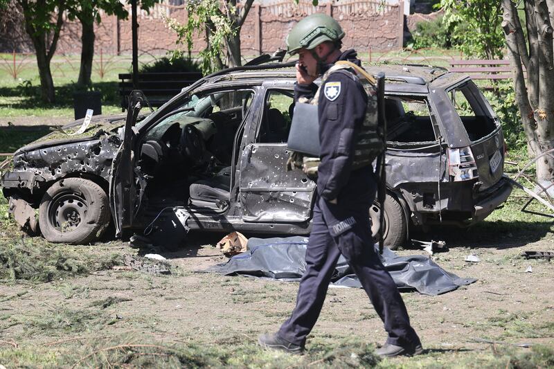 A police officer walks past the body of a victim following a Russian strike on Zolochiv in the Kharkiv region, northeastern Ukraine.