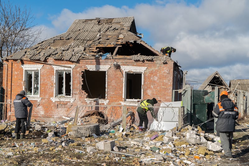Local residents carry out repair works on a damaged house after a Russian missile attack on Feb. 6, 2024, in Zolochiv, Kharkiv Oblast, Ukraine.