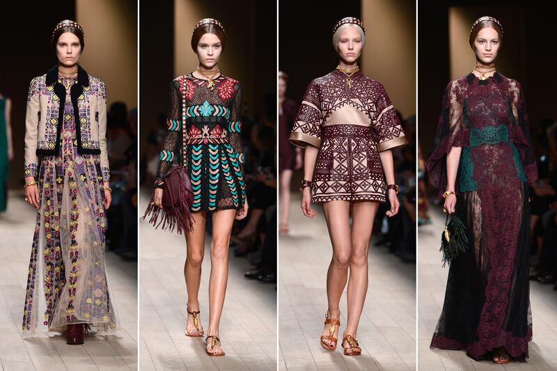 The clothes too were fit for royalty. Inspired by the elaborate costumes at the Rome Opera workshop, designers Maria Grazia Chiuri and Pierpaolo Piccioli presented an opulently romantic collection, featuring the most exquisitely ornate hand-stitched embroidery. What looked like ethnic or folk iconography was seen in the brightest of colors on suede, lace, and silk chiffon.