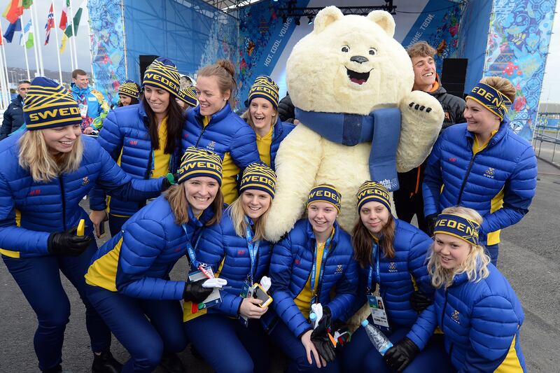Members of the Swedish delegation pose next to a mascot during the welcoming ceremonies on February 5 at the Amphitheatre Square.