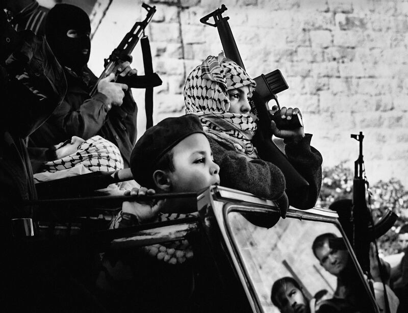Young Fatah Members at the Funeral Procession of a Palestinian Fighter, from the series The Scars of David, 2002. Inkjet print, ed. # 4/10, 19¾ x 26⅛ in. (50.2 x 66.4 cm).