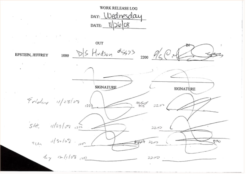 In yet another example below (Nov. 26, 2008), a series of handwritten lines with Epstein’s signature were affixed for 11/28, 11/29, 11/30, and 12/1 with no officer’s signatures (with a badge number written in on 11/30 and only one nearly illegible one on his 11/28 signout).