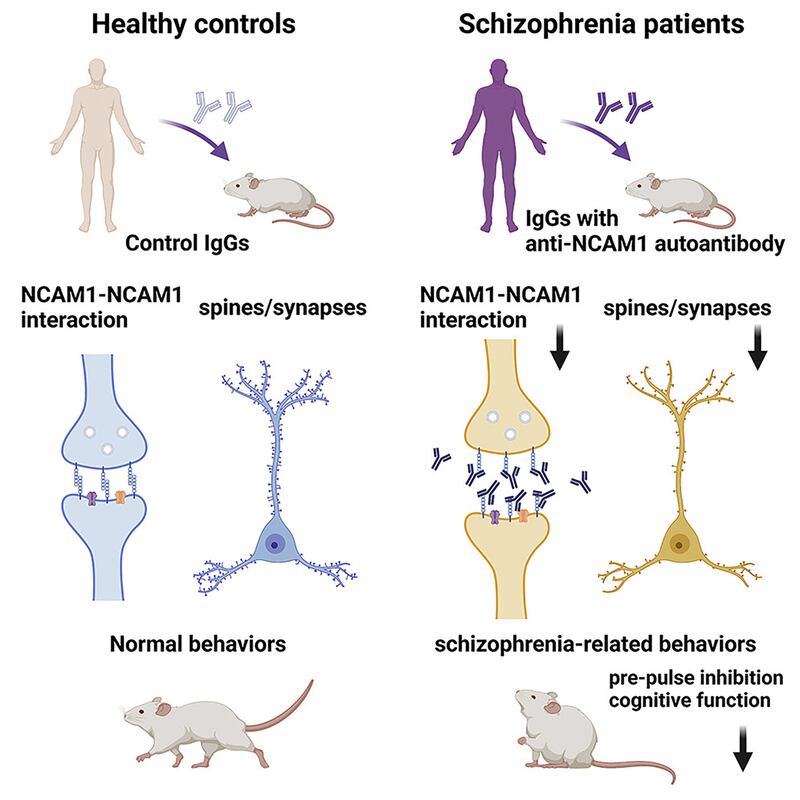 The researchers isolated the antibodies and injected them into mice. In addition to causing cognitive impairments and other behaviors characteristic of schizophrenia, the NCAM1 autoantibodies also reduced the number of connections in the brain.