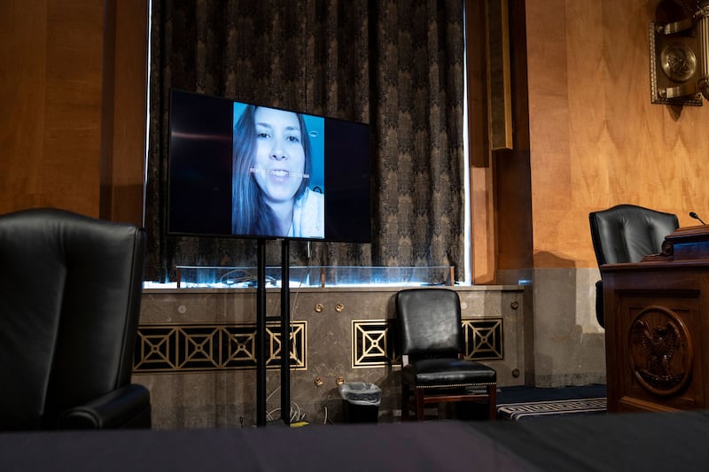 A TikTok video plays as social media executives testify before the Senate Homeland Security and Governmental Affairs Committee on Capitol Hill, Washington, D.C., on Wednesday Sept. 14, 2022.
