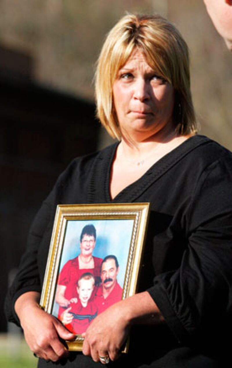 Michelle McKinney holds a photo of her father, Bennie, near a section of the Upper Big Branch Mine on April 6 in Montcoal, West Virginia. Rescue efforts to save four miners that remain unaccounted for have been suspended due to poison gasses trapped underground after 25 miners were killed in an explosion in the Massey Energy Company's coal mine on April 5.