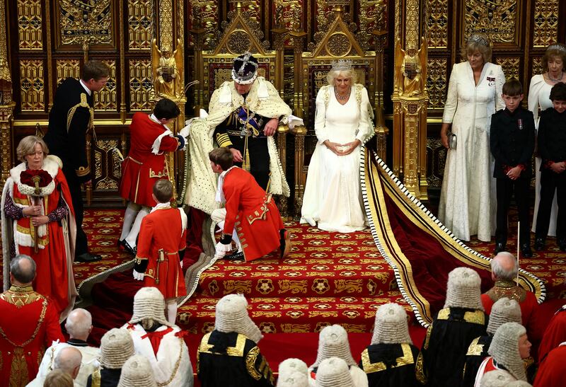 King Charles III sits alongside Britain's Queen Camilla during the State Opening of Parliament, at the Houses of Parliament, in London, on July 17, 2024.
