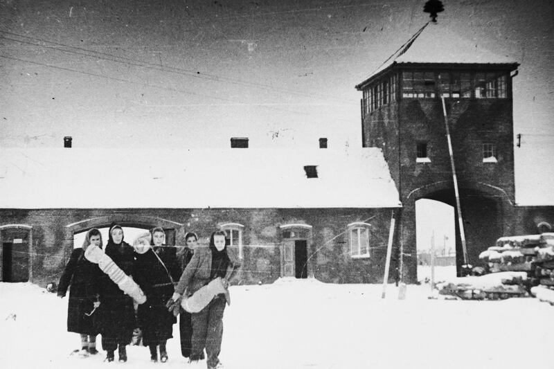 A group of female survivors of Auschwitz-Birkenau trudge through the snow as they depart from the camp through the main gate. The women have rid themselves of their prison uniforms and taken clothes from the burning storage houses. The image is a still from film taken by Henryk Makarewicz, who was a cameraman in the Polish Berling Army when it entered the camp in January 1945.