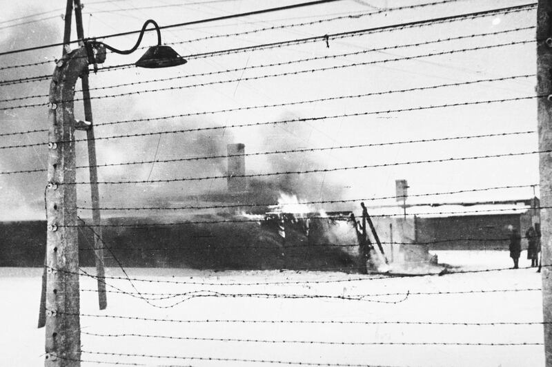 View through the barbed wire fence of the burning Kanada barracks in Auschwitz-Birkenau immediately after the liberation. Before leaving the camp, the Germans set fire to storage houses and to piles of human clothing.