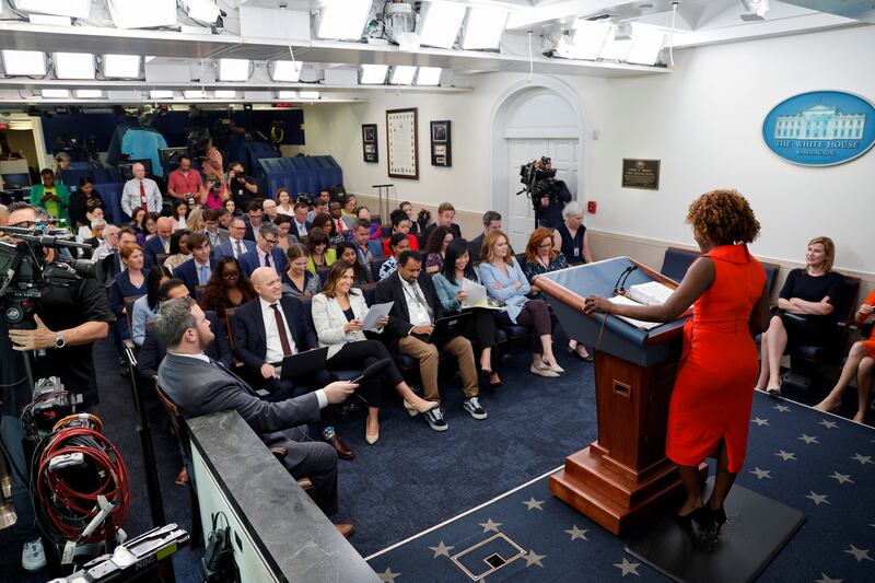 U.S. White House Press Secretary Karine Jean-Pierre holds the daily press briefing in a newly refurbished briefing room at the White House in Washington, U.S. July 24, 2023.