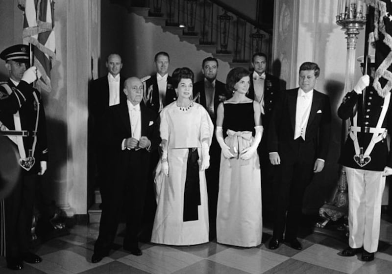 President Kennedy joins guests before a state dinner in honor of Peruvian President Manuel Prado. The presidents stand with their wives and officials for a formal portrait. In the front row: President Prado and Senora de Prado join Jacqueline Kennedy and President John F. Kennedy.