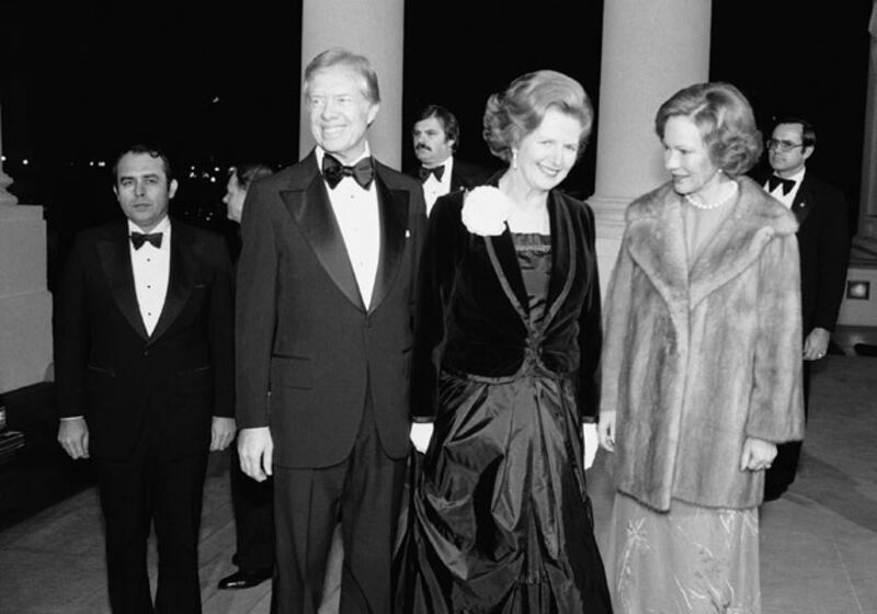 President and Mrs. Jimmy Carter welcome British Prime Minister Margaret Thatcher.