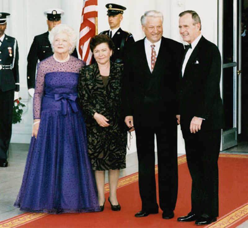 President George Bush and first lady Barbara Bush pose with Russian President Boris Yeltsin and Russian first lady Naina Yeltsin.