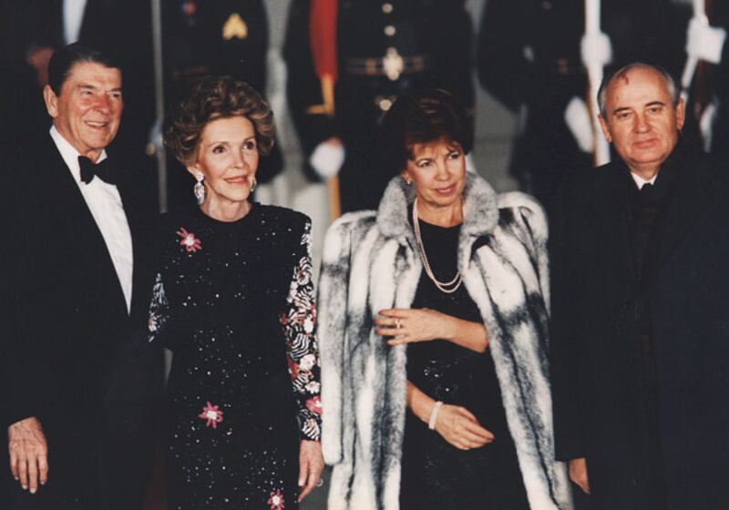 Ronald Reagan and first lady Nancy Reagan pose with Soviet Union President Mikhail Gorbachev and his wife Raisa Gorbachev.
