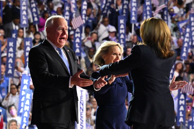 Tim Walz (L) and wife Gwen approach US Vice President and 2024 Democratic presidential candidate Kamala Harris at the conclusion of the fourth and last day of the Democratic National Convention.
