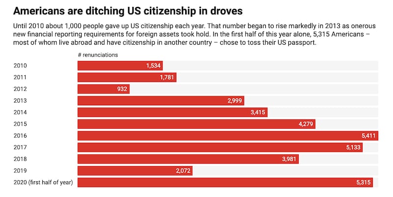 A record number of Americans are renouncing their citizenship. In just the first half of this year, 5,315 Americans gave up their citizenship. That puts the country on track to see a record-breaking 10,000 people renounce U.S. citizenship in 2020. Until a decade ago, fewer than 1,000 Americans per year, on average, chose to renounce their citizenship.