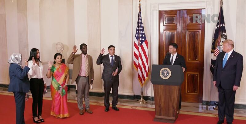 President Donald Trump hosts a naturalization ceremony for new citizens broadcasted during the RNC.
