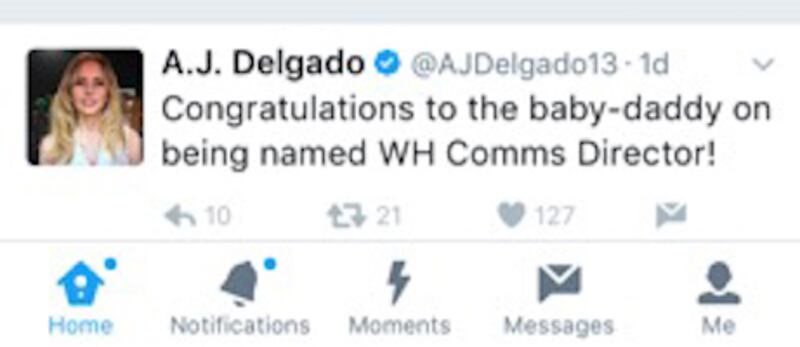 On the afternoon of the 22nd, Delgado tweeted “Congratulations to the baby-daddy on being name WH Comms Director!” seemingly referencing Miller who had just earned the position.