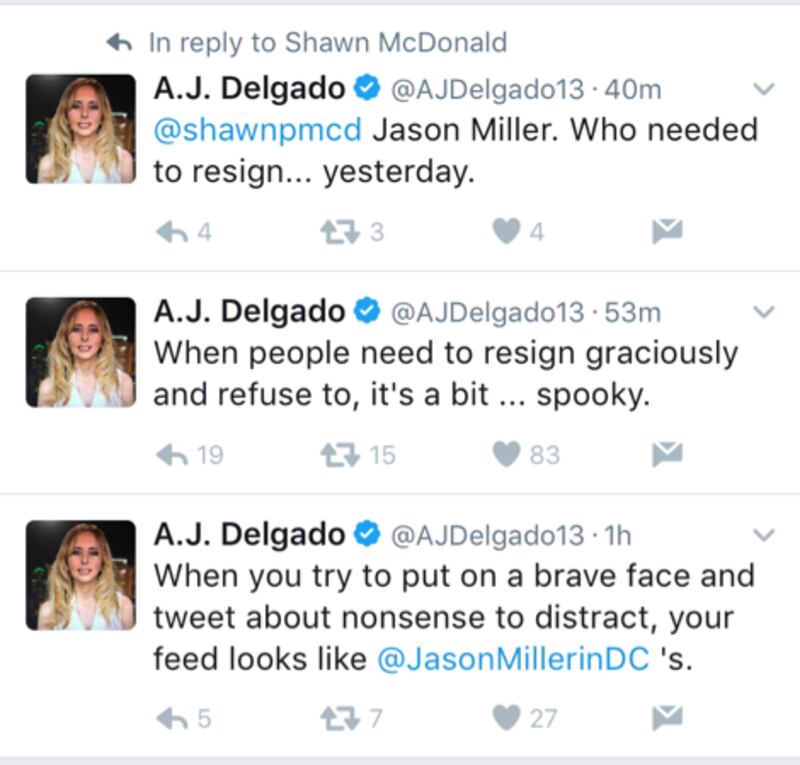 “When you try to put on a brave face and tweet about nonsense to distract, your feed looks like @JasonMillerinDC’s,” she mysteriously said. She intimated further that Miller was not leaving of his own accord initially. “When people need to resign graciously and refuse to, it’s a bit … spooky.”