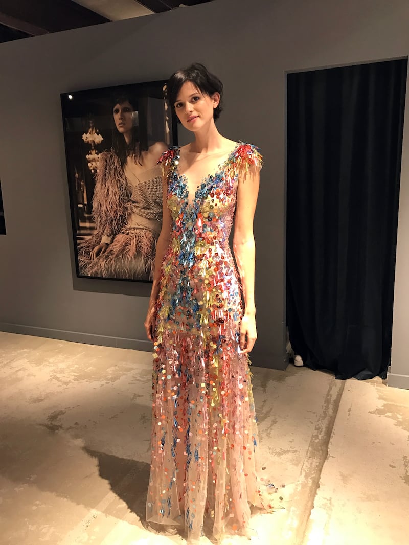 Around it were the bejeweled, and bead and sequin-encrusted gowns she is most famous for, and for whom her famous customers—Kate Middleton, Adele, and Kate Winslet among them—keep returning to her for.