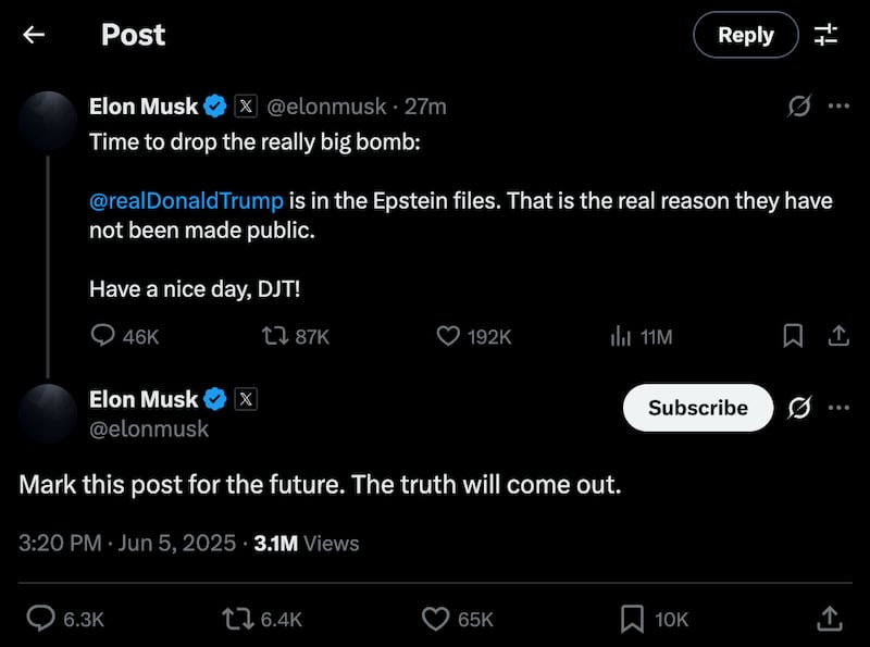 “Time to drop the really big bomb: @realDonaldTrump is in the Epstein files. That is the real reason they have not been made public. Have a nice day, DJT!” Musk wrote Thursday. “Mark this post for the future. The truth will come out.”