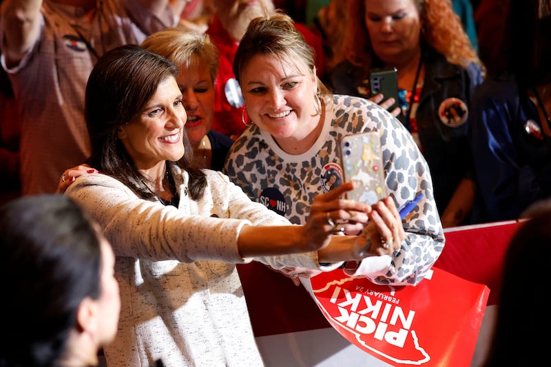 Republican presidential candidate Nikki Haley takes a selfie with her supporters during a campaign event before the South Carolina Republican presidential primary election in North Charleston, South Carolina.