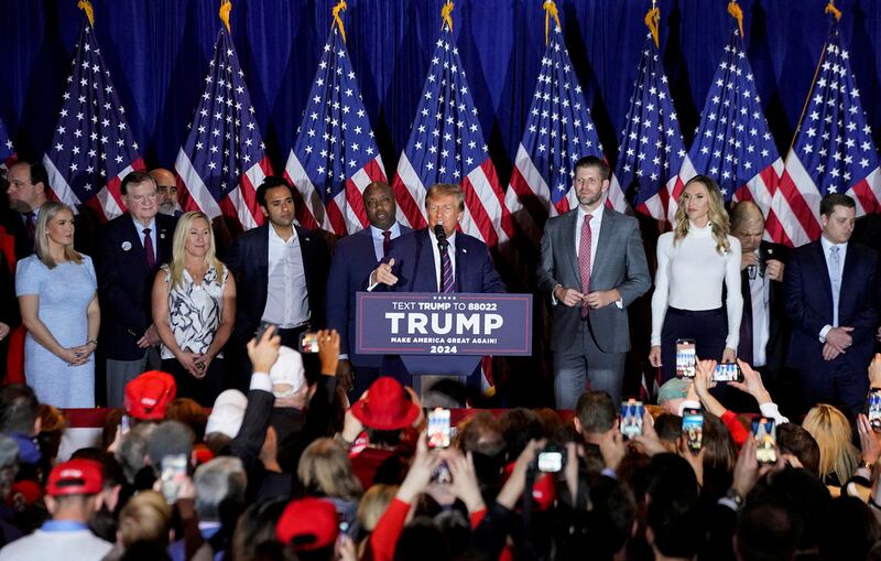 Rep. Marjorie Taylor Greene, former Republican presidential candidates Vivek Ramaswamy and Sen. Tim Scott, along with Eric Trump and his wife Lara, flank former President and Republican presidential candidate Donald Trump during a New Hampshire presidential primary election night watch party.