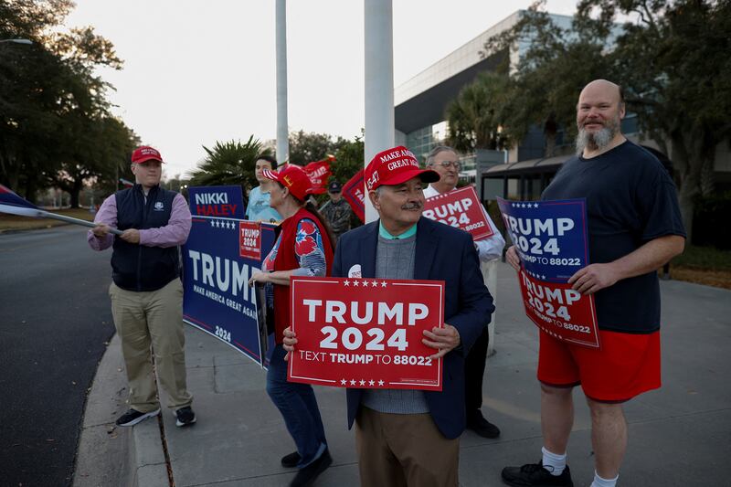 Miguel Munoz, of Summerville, South Carolina, holds a placard as he and other supporters of former President Donald Trump gather outside a rally of Nikki Haley before the South Carolina Republican presidential primary election in North Charleston, South Carolina.