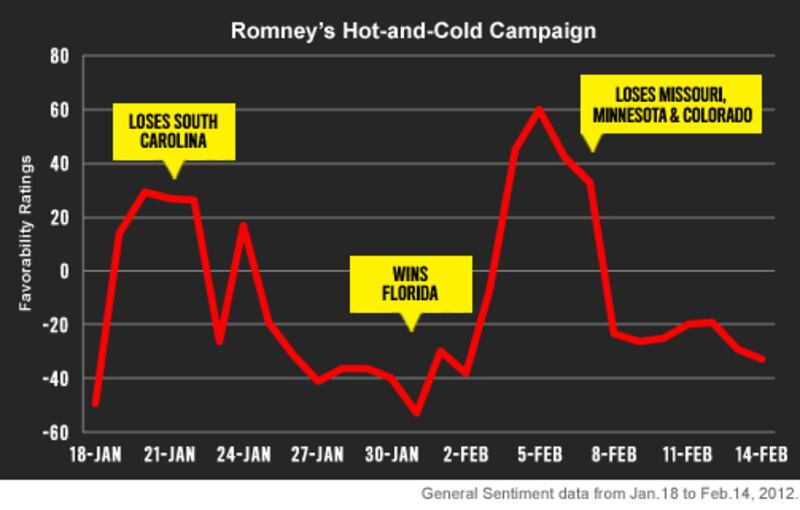 Romney's predicament boils down to a severe inability to drive the narrative, getting eclipsed by constant new surges and flash media memes. His ups and downs aren't ho-hum, they're dramatic. Each time he wins a primary, like in New Hampshire, Florida, or Nevada, the public falls in love anew, awarding him high favorability online, according to the Election Oracle. Each time he loses, like in South Carolina or Missouri, he's relegated not to the couch, but to the doghouse outside in the middle of February. As Rick Santorum publicly charts his path toward Michigan and Ohio, Romney now finds his rating at -33, lower than any other candidate's.