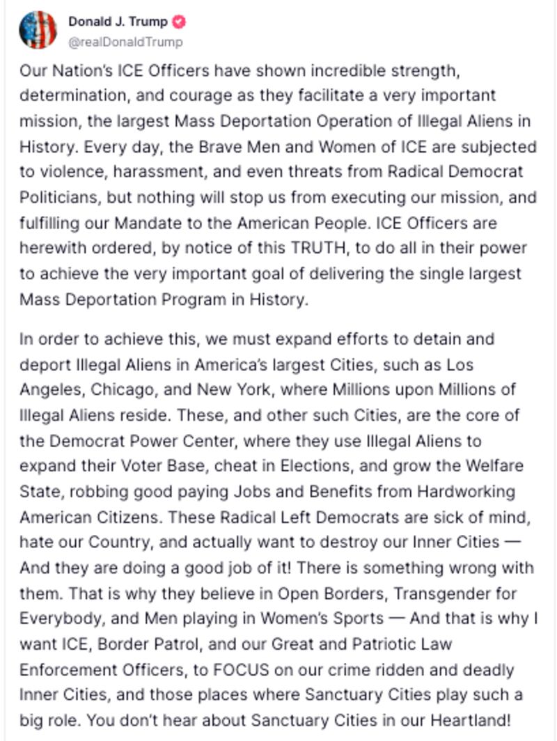 Continuing the post, he asserts, “These Radical Left Democrats are sick of mind, hate our Country and actually want to destroy our Inner Cities—And they are doing a good job of it! There is something wrong with them.” He condemns Democrats for supporting “Open Borders, Transgender for Everybody and Men playing in Women’s Sports” and asserts those beliefs are the reasons he wants “ICE, Border Patrol, and our Great and Patriotic Law Enforcement Officers to FOCUS on our crime ridden and deadly Inner Cities.”