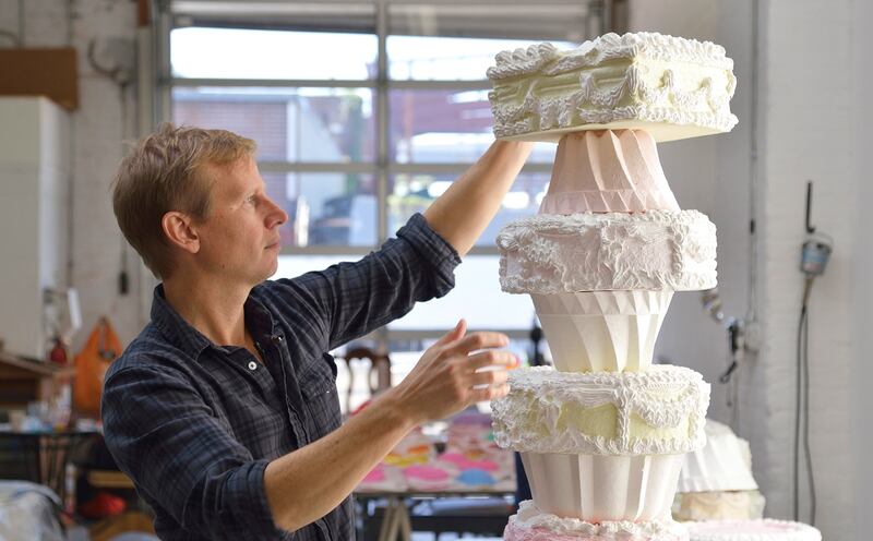 Will Cotton composing a cast paper sculpture at the Pace Paper workshop in Gowanus, Brooklyn.