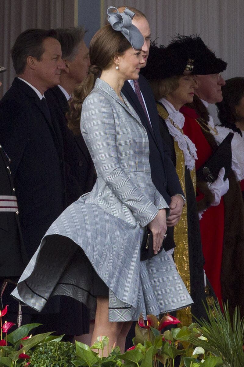 To be honest, Kate and her dressers should have seen this coming. All week, the newspapers have been reporting that the tail-end of Hurricane Gonzaolo was set to bring wild and blustery conditions to the UK yesterday.