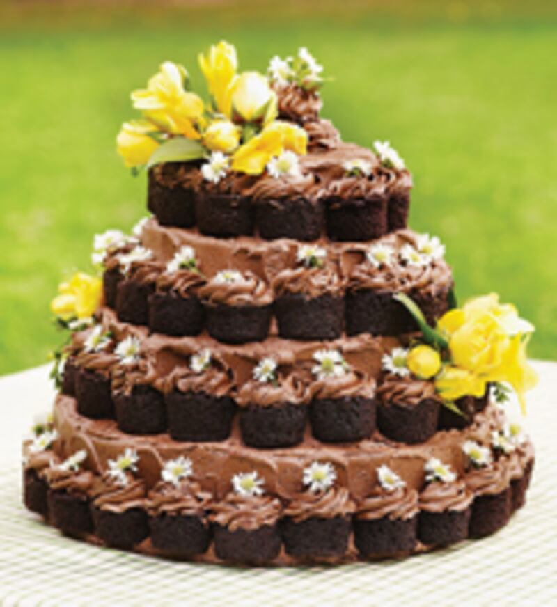 Sweet and simple is the name of the game. Velvety chocolate cream cheese icing covers tiers accented with halved bite-size cupcakes and fresh-picked blooms in this cake by Kitchenette Restaurant.