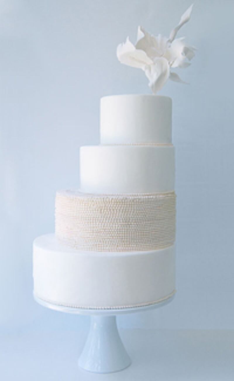 Artful and unique, this Art Deco-inspired design by Maggie Austin Cakes features 5,020 hand-formed fondant pearls and a sculptural gumpaste flower.