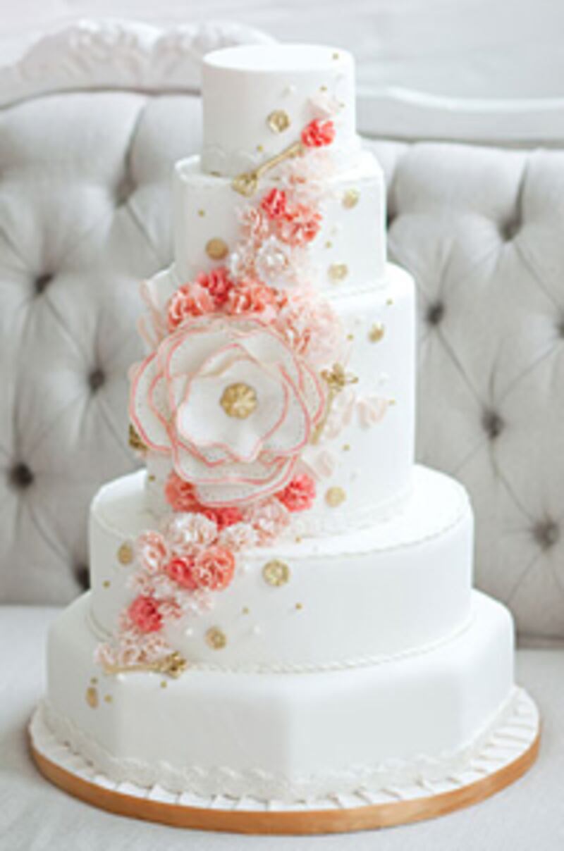 This five-tier hexagon gold fondant cake by Confetti Cakes uses a variety of textures to create even more drama—perfect for a reception space that has a lot of architectural interest.