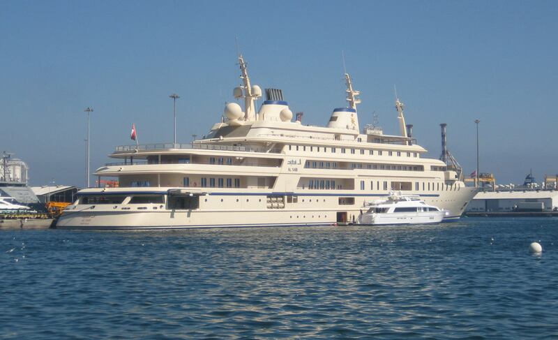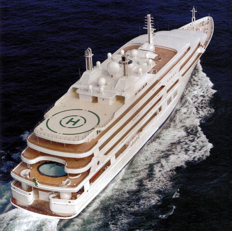 The yacht owned by the Saudi defense minister and son of King Fahd has eight decks, 92 rooms, and 96 crew members. It was launched in 1999 after a secret building process and bears an interior designed by the British decorator Terence Disdale. It has common megayacht amenities, such as a cinema, a helipad, and a Jacuzzi, as well as an indoor swimming pool enclosed by glass.